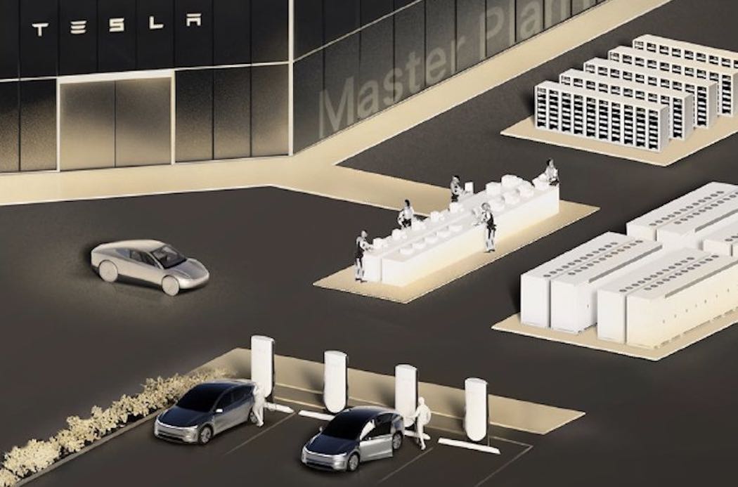 後方のパネルには「The Machine That Builds the Machine(機械が機械を作る)」という表記が見えます。テスラの工場を語るときに、イーロン・マスクがよく使うフレーズですね。
