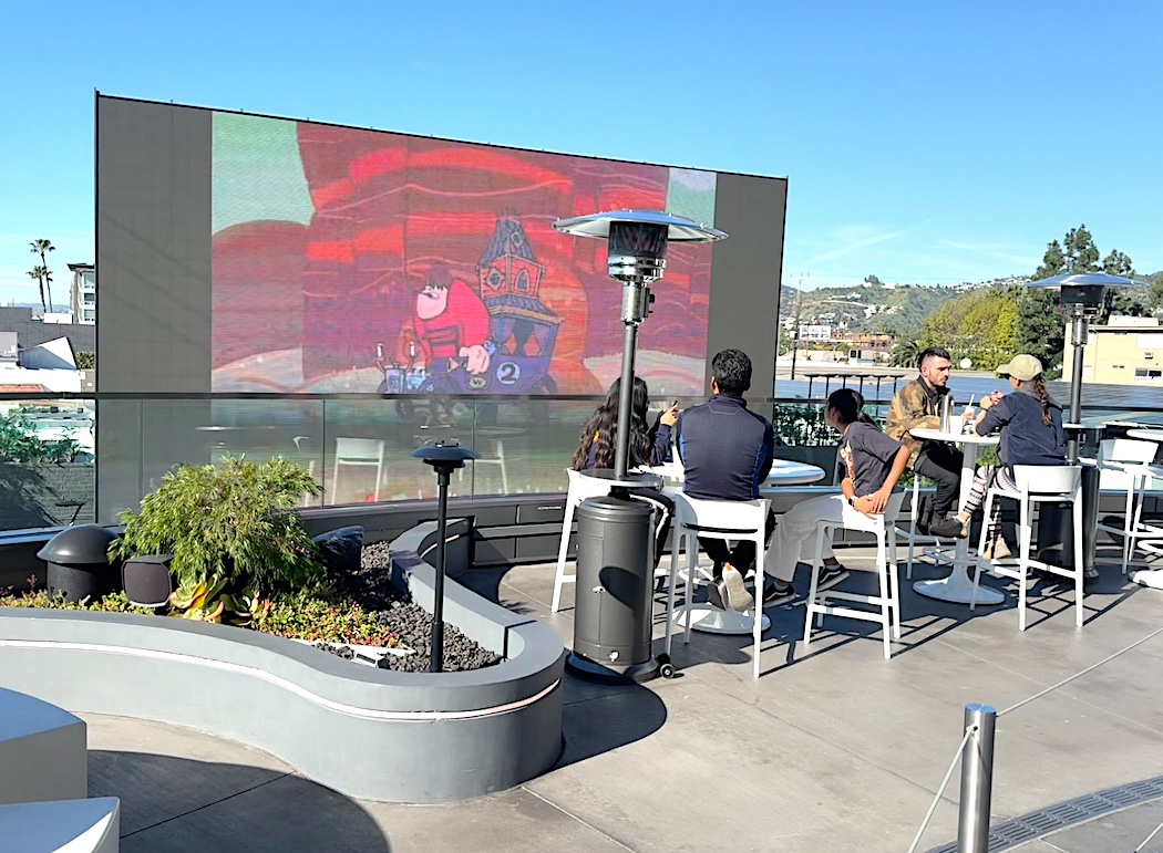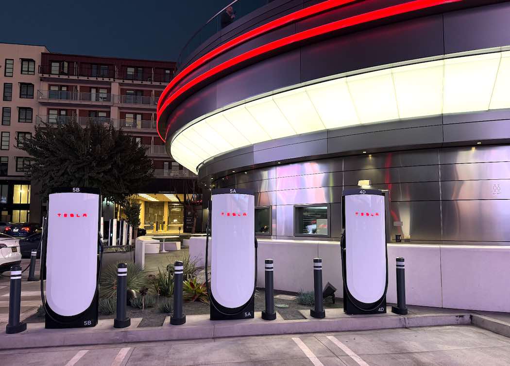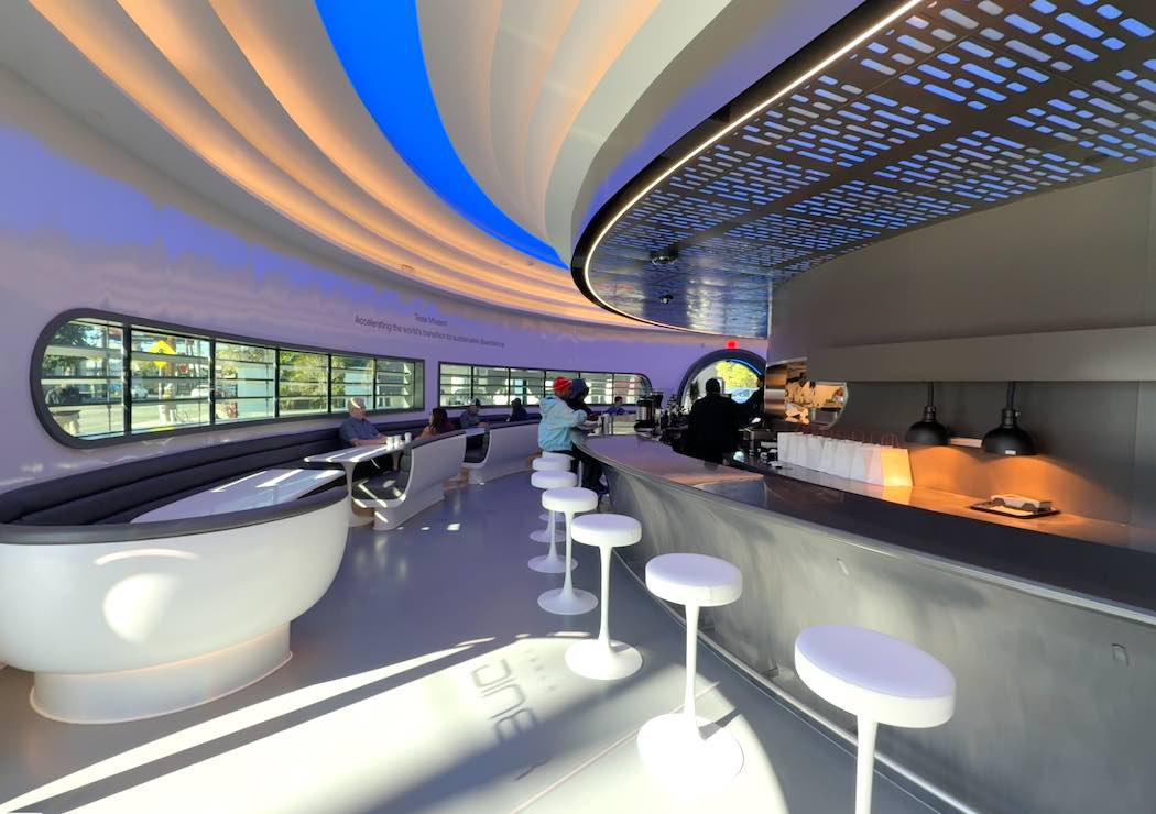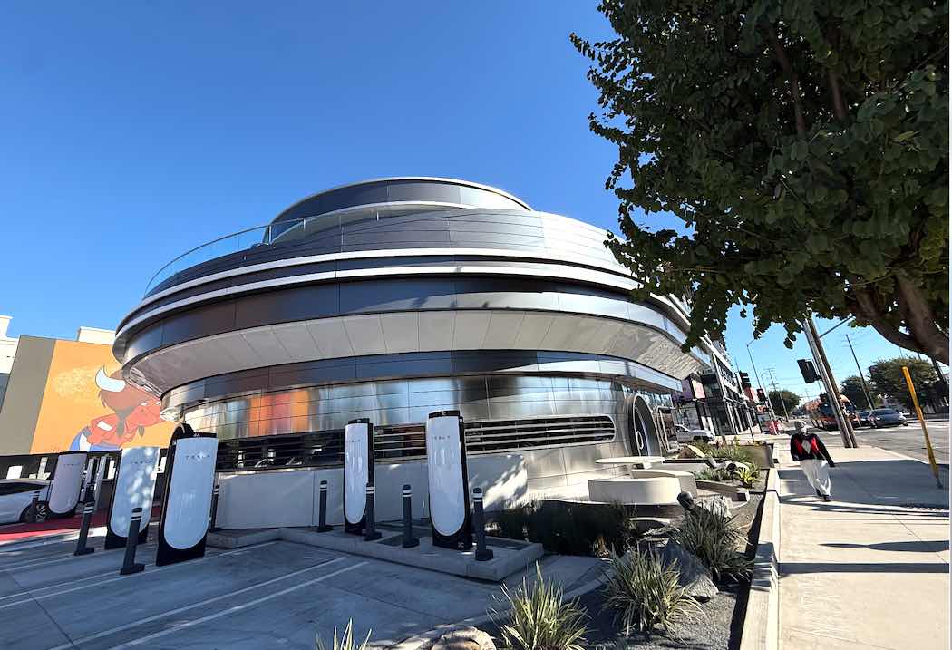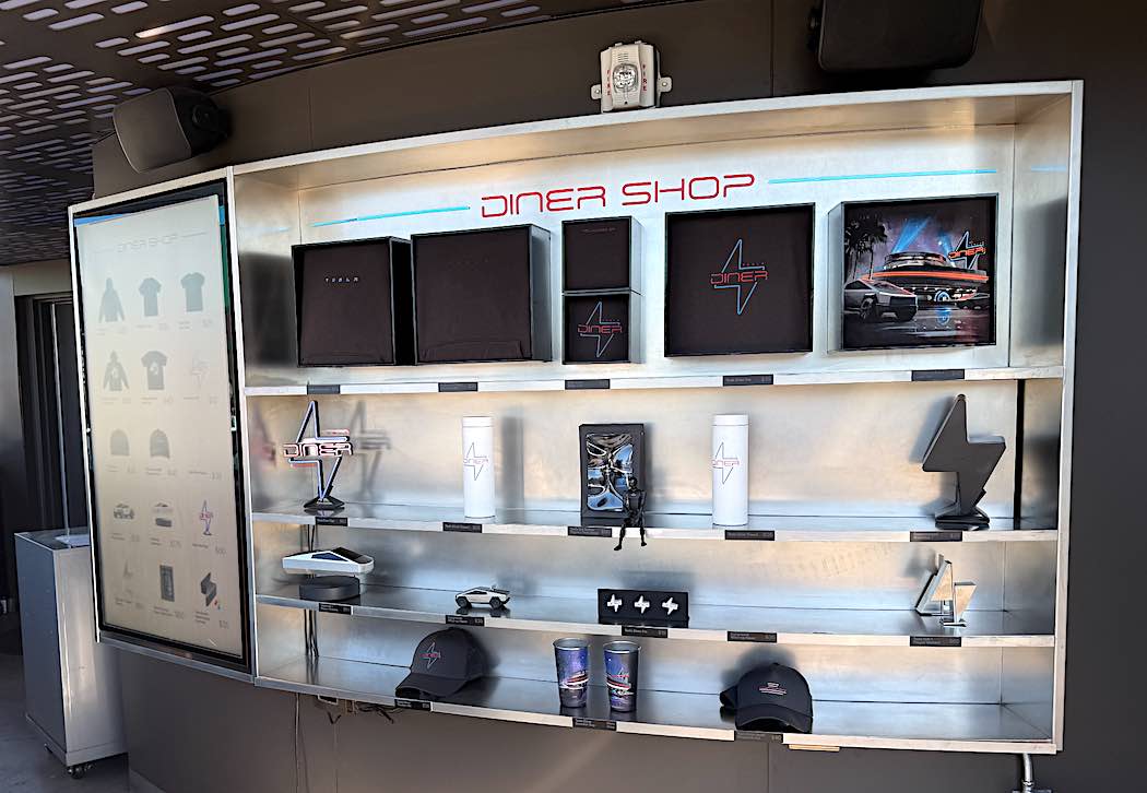 ダイナーとその隣の敷地には、V4のスーパーチャージャーが80基聳えています。円筒型のダイナーでは、1階席と2階席で食事ができます。ここ限定のテスラグッズも購入可能。外の大型モニターでは、映画やドラマが流れています。